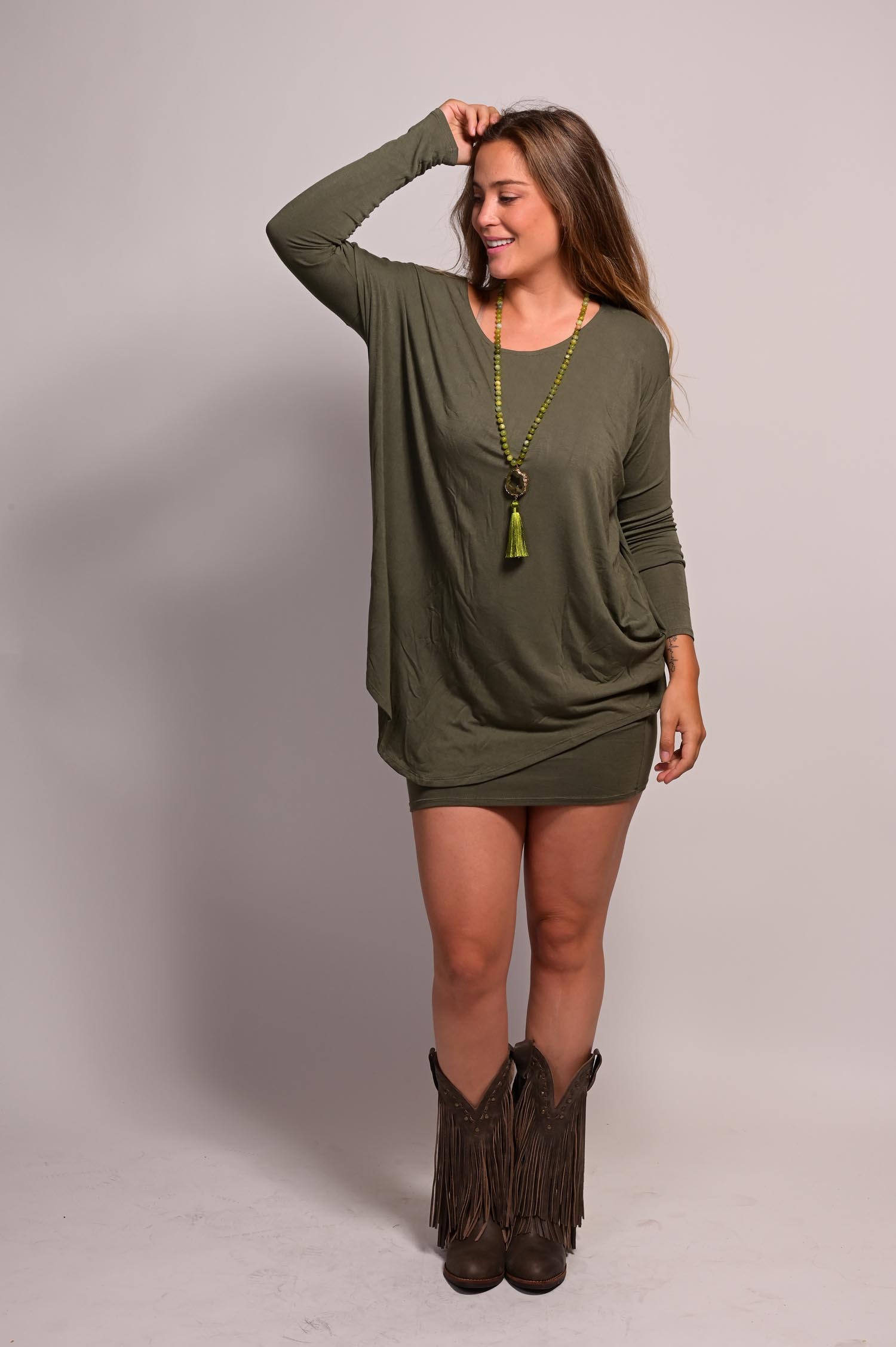 Material: Algodón • Cuello: Redondo • Con bolsillos • Manga larga • Úsalo con calzas, como una polera larga también y complementa con un cuello de lana.